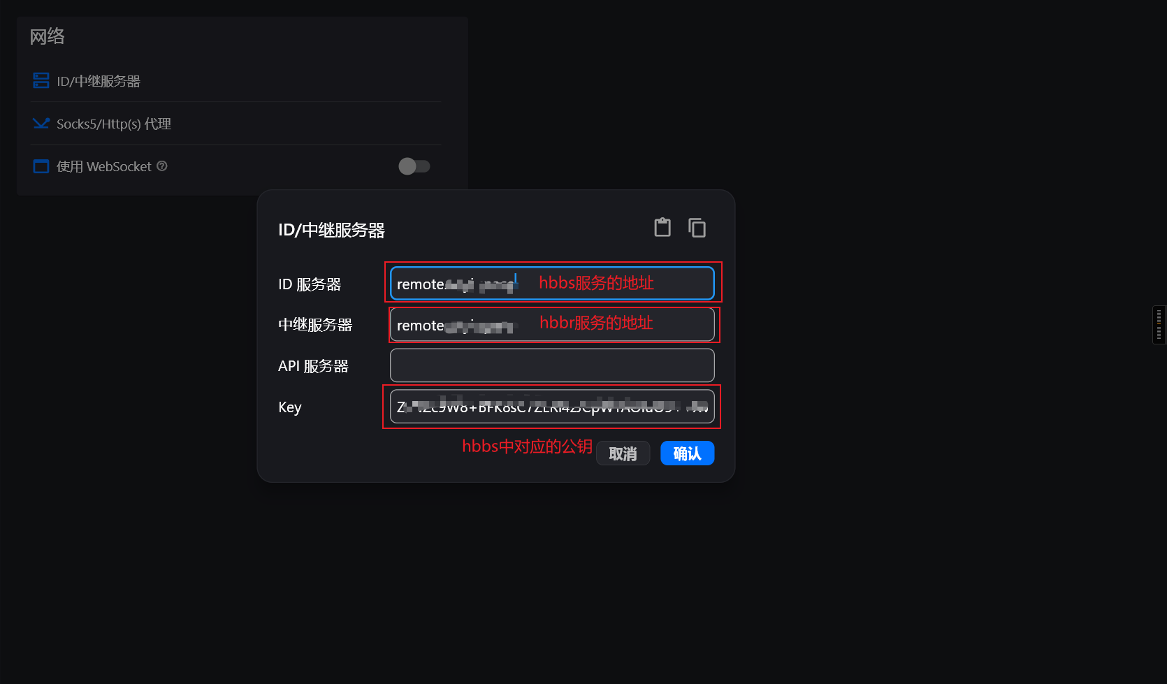 - ID服务器为hbbs服务的地址,如有服务端有端口的修改,则可以使用HOST:PORT的格式填写